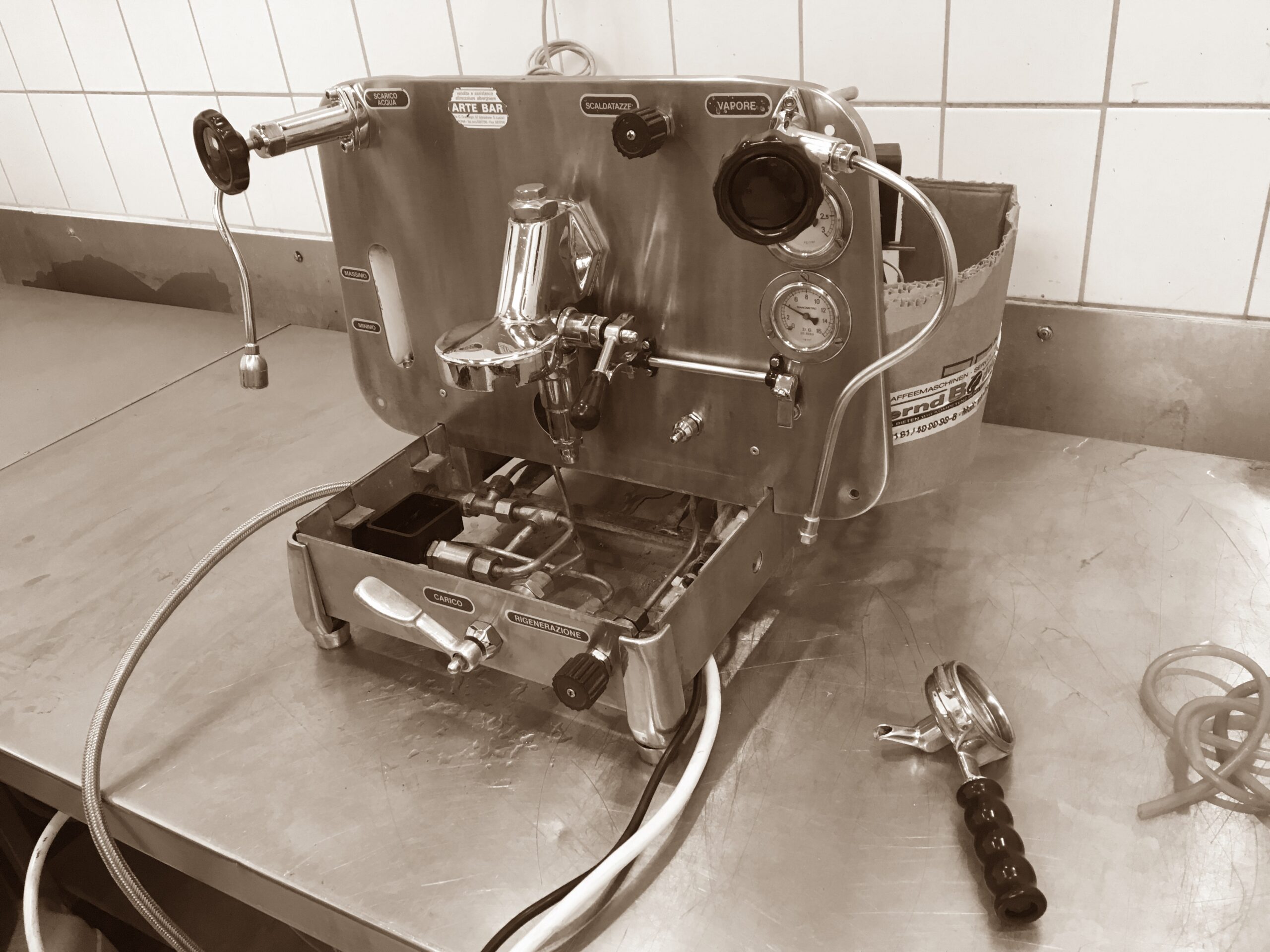 Zu guter Letzt, kommt die Funktions- und Qualitätsprüfung. Wenn der Restaurator dann vollkommen zufrieden ist, genießt er einen frisch gemachten Espresso aus einer Kaffeemaschine mit Geschichte.